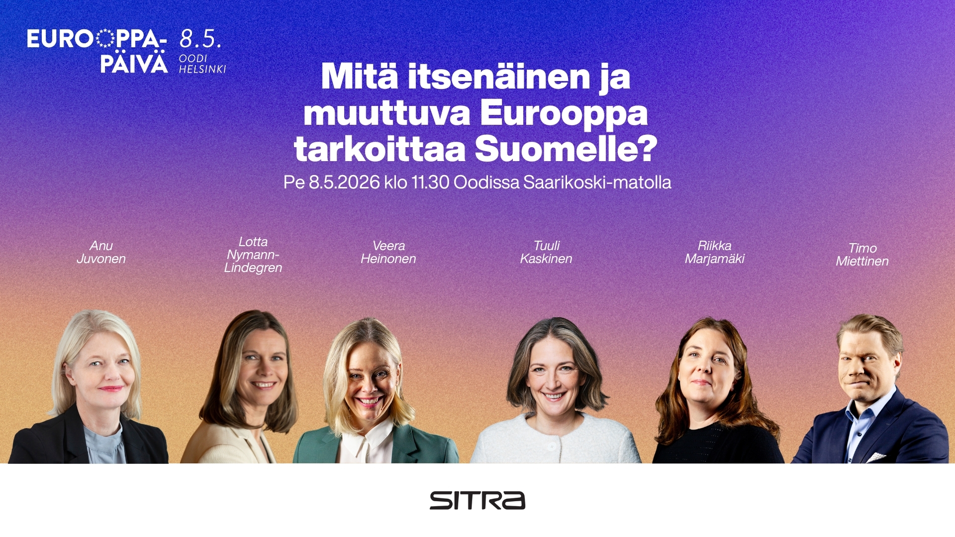 Pääministeri Petteri Orpo pitää 8.5.2026 EU-poliittisen linjapuheensa Aalto-yliopistolla. Puhe näytetään Saarikoski-matolla suorana. Ensimmäisiä kommentteja puheesta Eurooppa-päivän tapahtumasohvalta ovat antamassa toimittaja ja vuoden nuori eurooppalainen 2025 Marleena Pellin johdolla Ulkopoliittisen instituutin Euroopan unioni ja strateginen kilpailu -tutkimusohjelman ohjelmajohtaja Juha Jokela ja Eurooppanuorten puheenjohtaja Pieta Päivänen.
